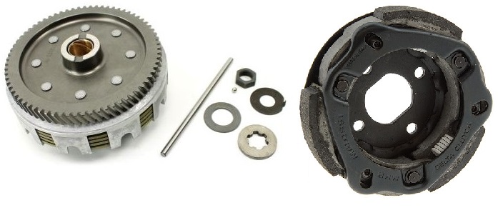 Sur scooter, plus l'on accélère, plus la courroie tourne vite et l'embrayage se déploie pour que les garnitures accrochent progressivement sur la paroie de la cloche qui transmet ensuite l'énergie à la transmission. Il est complété par le correcteur de couple qui à pour effet d'éviter au moteur de peiner au départ comme pour le variateur et qui est "reglé" avec un ressort de poussé plus ou moins dur selon la configuration du moteur.