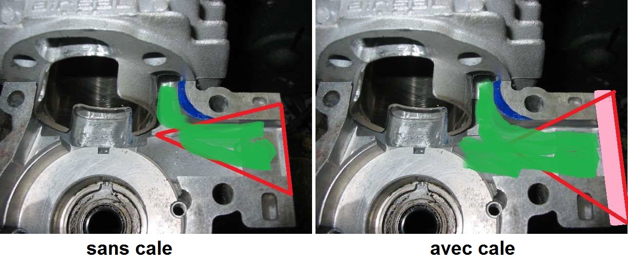 La cale de clapets augmente la hauteur de la boite à clapets ce qui permet de dégager le transfert arrière du cylindre et d'optimiser le volume du carter selon la cylindrée et donc de mettre des boite à clapets comme par exemple la Vforce TPR de chez Top Perf'.