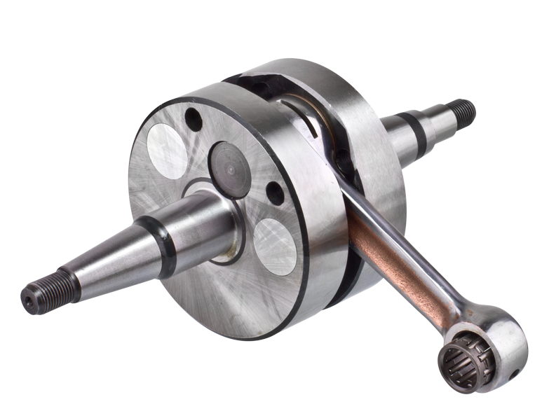 Le vilebrequin traverse de part et d'autre le bas moteur. Il est monté sur roulements et tourne sur lui même pour faire monter et descendre la bielle et déplacer le piston du PMH (Point Mort Haut) au PMB (Point Mort Bas).