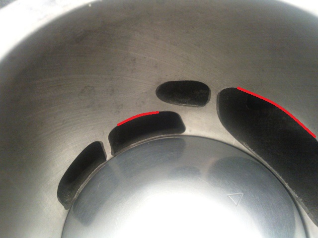 Mesure et prépas : On mesure un diagramme simplement avec un disque gradué en degré que l'on fixe sur la queue du vilebrequin côté allumage. On positionne le piston après avoir passer le PMH (Point Mort Haut) juste au bord du haut de la lumière que l'on veut mesurer mais il ne faut pas que l'on puisse regarder dedans ! Il faut vraiment être à fleur (au niveau du trais rouge ci-dessous) ! Et l'on positionne et fixe correctement son disque à diagramme à zéro face à un repère. Ensuite on fait tourner le vilebrequin pour que le piston descende au PMB (Point Mort Bas) jusqu'à ce qu'il revienne fermer la lumière en haut, à fleur également, et l'on relève la mesure. En fonction de la mesure relevée, on va pouvoir déterminer de combien de milimètre on peu agrandir la lumière en question. Si l'on agrandir de 2mm par exemple, il ne faut pas oublier de faire un léger chanfrein pour que le ou les segments ne bloquent pas dans la lumière.
