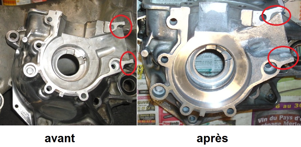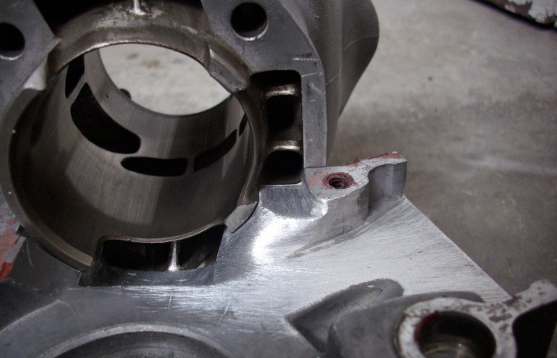 Mesure et prepas : Toute la partie grattée ci-dessus est la partie à travailler. Il faut aligné l'admission en fonction du cylindre que l'on a (si l'on prépare le haut moteur, il faut le faire avant bien sûr). On peut également boucher les volumes morts au niveau de la boite à clapets comme les trous des vis de clapets (attention à laisser assez de profondeur pour visser correctement tout de même). Après avoir travailler cette zone, il faut faire en sorte que la matière soit lisse mais sans être polie ! Soit en ponçant au 150 soit en sablant. Il faut légèrement qu'elle soit rugueuse pour favoriser le mélange air-essence-huile. Le but de ce travail est le gain de couple et de puissance.