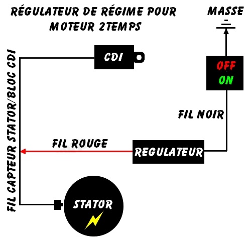 Un régulateur de régime est un appareil électronique qui se branche sur l'allumage et qui permet à l'aide d'un bouton ON/OFF, de brider l'allumage à un certain régime pour ne pas dépasser une certaine vitesse.