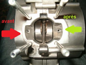 Explications : Les transferts du bas moteur ont d'origine une forme qui freine le mélange air-essence-huile. Le but de cette préparation est de travailler cette forme pour enlever la partie freinante et également d'aligner les transferts du bas moteur avec ceux du haut moteur.